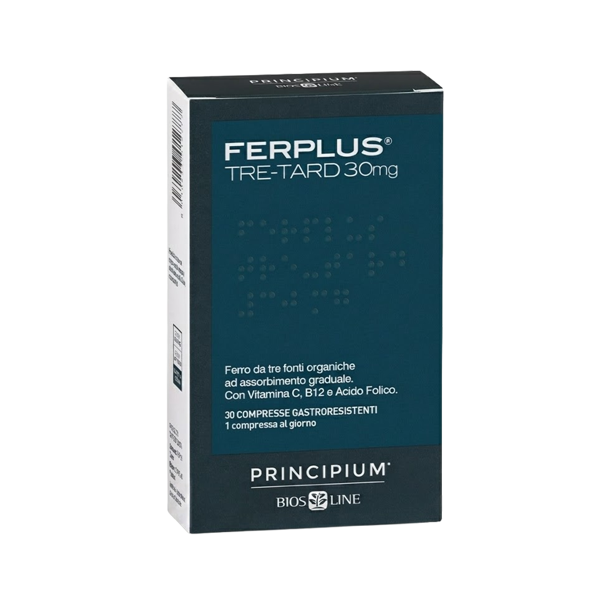 BIOS LINE PRINCIPIUM FERPLUS TRE-TARD 30MG 30CPR è la soluzione nutrizionale d'eccellenza per colmare le carenze di ferro senza i comuni e fastidiosi effetti collaterali legati a questo tipo di integrazione. Il Ferro è un minerale vitale: trasporta l'ossigeno nel sangue, garantisce la corretta divisione cellulare e sostiene le difese immunitarie. Tuttavia, la sua carenza è molto frequente e causa profonda stanchezza, fiato corto, pallore e debolezza di unghie e capelli. FerPlus Tre-Tard supera i limiti dei classici integratori di ferro grazie a una formulazione gastroresistente e a una tecnologia di rilascio intelligente in tre fasi, che assicura all'organismo una disponibilità costante del minerale.
