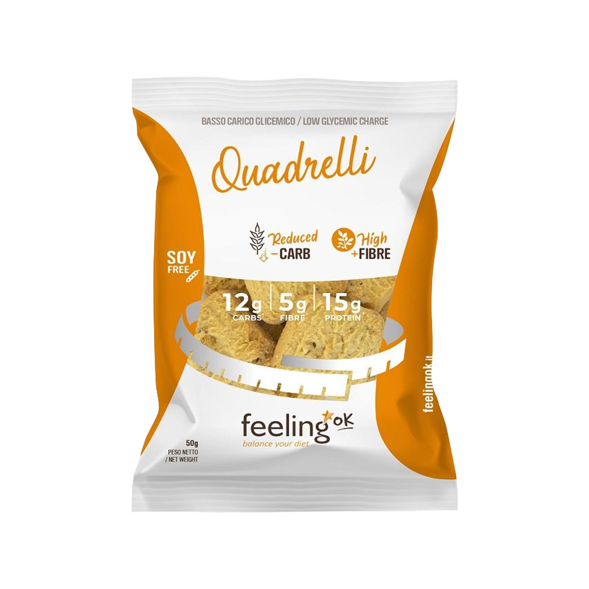 Realizzati con una formula innovativa, i Quadrelli +Fibre di FeelingOk sono biscottini studiati per offrire un’opzione nutrizionale bilanciata, ideale per chi segue un’alimentazione a ridotto apporto di carboidrati. Caratterizzati da un elevato contenuto di proteine (30%) e fibre (10%), questi biscottini rappresentano una soluzione gustosa e funzionale per supportare la tonicità muscolare e favorire un prolungato senso di sazietà. Con soli 25% di carboidrati, si adattano perfettamente a diete che mirano a ottimizzare il metabolismo energetico, attingendo energia dalle riserve di grasso corporeo.