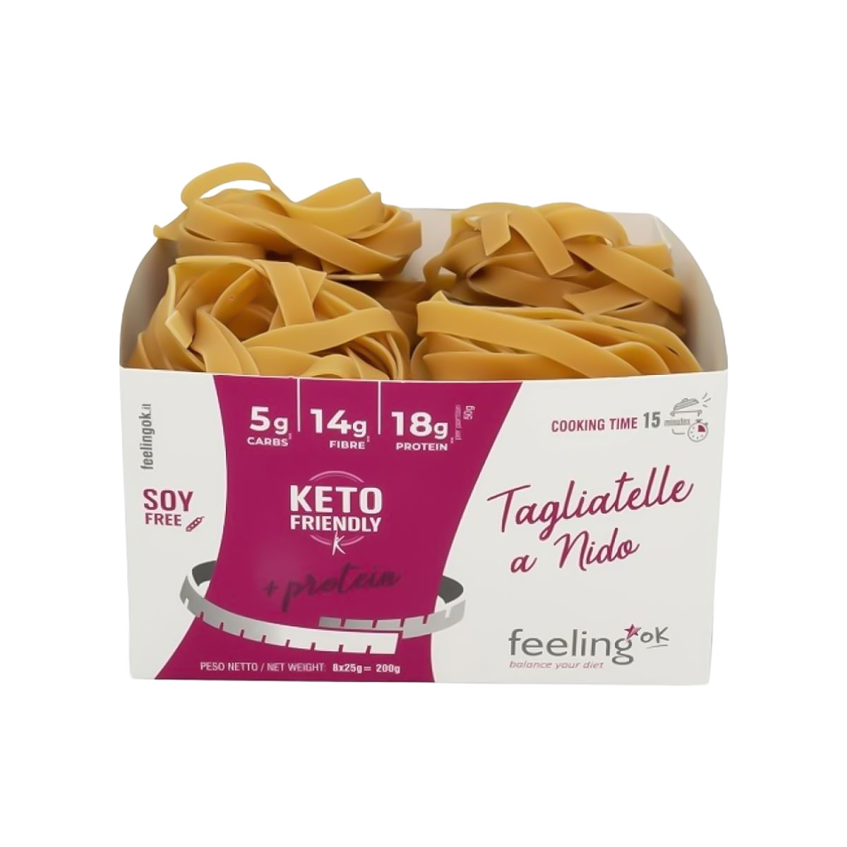 Le Tagliatelle a Nido Naturali +Protein di FeelingOk rappresentano una soluzione innovativa per chi desidera gustare la tradizionale pasta italiana senza rinunciare a un’alimentazione controllata e bilanciata. Realizzate con ingredienti selezionati, queste tagliatelle combinano il sapore autentico della pasta con un profilo nutrizionale ottimizzato, caratterizzato da un ridotto apporto di carboidrati e un elevato contenuto di proteine. Ogni confezione contiene 8 nidi da 25 g, per un totale di 200 g, progettata per offrire praticità e versatilità in cucina, adattandosi a diverse esigenze dietetiche.